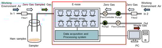 The experiments were conducted for 12 days in a clean, well-ventilated testing room (approximately 45 square meters) at a temperature of 25 °C ± 1 °C and a humidity level of 40% ± 2%. Each of the five ham samples was measured 10 times per day by a skilled operator, with fresh samples used for each daily experiment. To minimize baseline fluctuations and interference from other volatiles, volatile compound profiles were acquired in a controlled environment. Zero gas (a baseline) was generated using two active charcoal filters (Filter 1 and Filter 2 in Figure 4) to ensure consistency between reference air and sample air.
