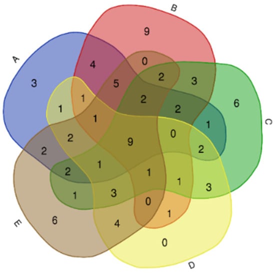 The Venn diagram was employed to visualize the distribution of volatile compounds among the sample groups, facilitating the identification of both shared and unique compounds. This graphical representation aids in understanding the compositional overlap and specificity among different samples.