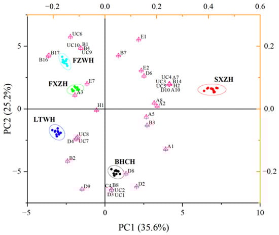 To further highlight the differences in aroma-active compounds among the five dry-cured hams, a PCA was performed using the hedonic assessment data. A PCA is a statistical tool used to intuitively show the data distribution in a low-dimensional space by extracting meaningful information from the raw data, allowing data to be grouped according to the similarity of the input characteristics to determine the distance between classes. The high separation between clusters indicates effective classification, while overlap suggests less distinction. The PCA extracted four principal components with eigenvalues greater than one, accounting for a cumulative contribution rate of 94.59%. The first component (PC1) and the second one (PC2) explained 35.6% and 25.2%, respectively, and the projections of these two primary components for the ham samples are shown in Figure 6. PC1, the most significant variable, was positively correlated with most aroma-active compounds with hedonic values higher than six (excluding one unknown compound, UC10). The two most expensive hams (BHCH and SXZH) were positioned on the positive PC1 axis, while the other three (FXZH, LTWH, and FZWH) were on the negative PC1 axis, indicating that PC1 can preliminarily distinguish between hams of different price points. These results suggest a positive correlation between aroma-active compounds with high hedonic scores and the price of dry-cured hams. Furthermore, the PCA showed clear separation among the five ham types, demonstrating the effectiveness of combining a PCA with a GC–O analysis to discriminate odor attributes. Notably, SXZH was located in the top right part of the plot, distinctly separated from the other clusters, reflecting its complex odor composition relative to the other hams.