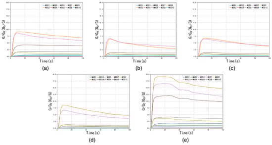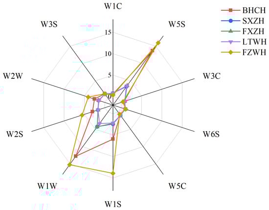 The E-nose was employed to differentiate the dry-cured hams and compare the results with those from the GC-MS-O analysis. The examples of the E-Nose response curves in the collection stage were shown in Figure 7. The data obtained from each sensor from 81-100 s was used as the stable value for the subsequent analysis. Figure 8 presents a radar chart depicting the responses (stable value) of the 10 sensors to the volatile compounds in the five ham samples. Sensors W1W, W1S, and W5S exhibited stronger responses to the volatile compounds in BHCH and FZWH compared to the other three samples, suggesting that these hams may contain higher levels of higher sulfur-containing compounds, terpenes, alkanes, and other volatile substances that triggered stronger sensor responses.