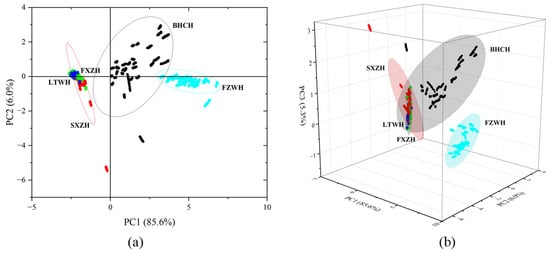To enhance the interpretation of the data, a PCA was performed on the stable values recorded by the 10 sensors for the ham samples. The PCA results are shown in Figure 9a. The x-axis represents PC1, which accounts for 85.6% of the variance, while the y-axis represents PC 2, which accounts for 6.0% of the variance. The cumulative variance explained by PC 1 and PC 2 was 91.6%, indicating minimal information loss. As shown in Figure 9a, the BHCH group (the most expensive ham sample) and FZWH group (the cheapest ham sample) were clearly distinguished from the other groups by the PCA analysis, while the other three ham groups (SXZH, FXZH, and LTWH) showed a relatively high overlap. Furthermore, the projections of the three primary components of PCA are shown in Figure 9b. The cumulative variance of PC 1, PC 2, and PC 3 was 96.3%, showing a smaller loss of information compared with the projections of the two primary components. However, the data distribution among the five ham samples remained similar, suggesting that while PCA combined with E-nose can effectively distinguish between the most and least expensive hams, it is less effective for distinguishing between all five dry-cured hams. The E-nose, therefore, serves as a quick analysis tool for broad classifications but does not provide the comprehensive and detailed evaluation achievable with a GC-MS-O analysis.