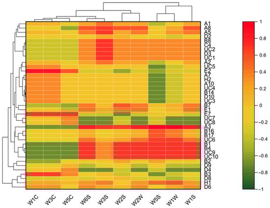 To explore the correlations between E-nose sensor responses and the aroma-active compounds identified by GC-MS-O, a correlation heatmap was constructed using the steady values from each of the ten E-nose sensors as the X variables, and the average hedonic scores of aroma-compounds as the Y variables. The resulting heatmap provides a clustering overview of sensor responses in relation to key odorants, facilitating the identification of compound–sensor patterns specific to each ham type. As shown in Figure 10, the 10 sensors can be grouped into different clusters based on their responses. For instance, a cluster of three sensors (W1C, W3C, and W5C) exhibited negative correlations with certain aroma-active compounds, including Hexanal (B1), Benzaldehyde (B4), Unknown compound 9 (UC9), and Unknown compound 10 (UC10). In contrast, the other seven sensors (W6S, W3S, W2S, W2W, W5S, W1W, and W1S) showed positive correlations with these compounds. According to the GC-MS-O results, these compounds were exclusively found in FZWH, indicating that the E-nose could effectively distinguish FZWH from other ham samples based on its specific responses to these aroma-active compounds. The findings align with the PCA results from the E-nose analysis. Additionally, the same sensor cluster (W1C, W3C, and W5C) exhibited negative correlations with 2-Nonenal, (E)- (B8), Pentadecane (C4), Unknown compound 2(UC2), 3-Octanone (D3), and Unknown compound 1 (UC1), while the other seven sensors correlated positively with these compounds. The GC-MS-O results indicated that these compounds were unique to BHCH, demonstrating that the E-nose could similarly differentiate BHCH from other ham samples.