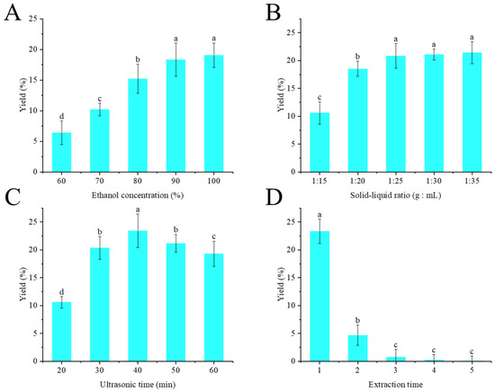 Effect of ethanol concentration (A), solid-to-liquid ratio (B), ultrasonic time (C), and extraction runs (D) on the extraction yield of crude flavonoid extract from distillers grains (Bars with the same letters indicate no significant difference (p > 0.05)).