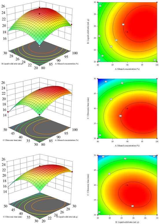 The steeper the response surface map is or the more elliptical the contour map is, the more significant the interaction is. As can be seen from Figure 2, the results of the response surface analysis showed that the interaction surfaces between the ethanol concentration and the liquid-to-solid ratio as well as the liquid-to-solid ratio and ultrasonic time had significant steepness characteristics. The contour lines presented an obvious elliptical distribution pattern, indicating a significant interaction relationship between the two (p < 0.05). In contrast, the response surface of the ethanol concentration and ultrasonic time showed a gentle changing trend. The contour line shape was approximately circular. This feature indicated that the interaction between the two has not reached a significant level (p > 0.05). This result was consistent with the analysis conclusion presented in Table 2.