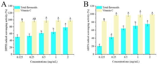 Antioxidant activities of the crude flavonoid extract from Moutai distillers grains. (A) DPPH free radical scavenging activity, (B) ABTS free radical scavenging activity (Bars with the same letters indicate no significant difference (p > 0.05)).