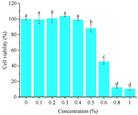 The cytotoxicity analysis of crude flavonoid extract from Moutai distillers grains was carried out based on the method proposed by Kumar and Singh (2025) [23] with some modifications. Briefly, HaCaT cells in the logarithmic growth phase and in good condition were inoculated into 96-well plates at a rate of 1 × 104 cells per well and cultured under 37 °C and 5% CO2 (Heracell Vios 160i CR, Thermo Fisher Scientific Inc., Shanghai, China) for 24 h. Then, the culture medium was aspirated, and the cell was rinsed with PBS buffer three times. DMEM containing 0 (control group), 0.1%, 0.2%, 0.3%, 0.4%, 0.5%, 0.6%, 0.7%, 0.8%, 0.9%, and 1% of crude flavonoid extract from Moutai distillers grains was added. After culturing for 24 h, the supernatant was discarded, and 100 μL of CCK-8 solution was added to each well. After incubation at 37 °C for 1 h, the absorbance was determined at a wavelength of 450 nm using an enzyme-linked immunosorbent assay reader (Agilent Synergy H1, Temecula, CA, USA). The cell viability was calculated as follows: