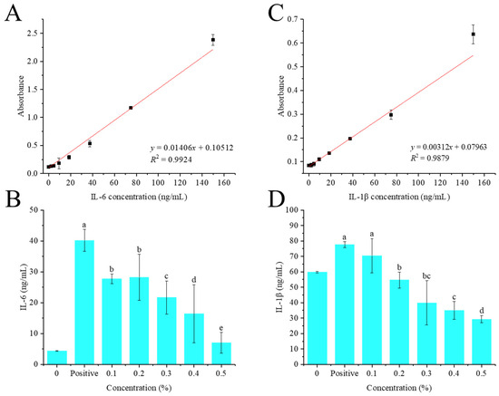 Anti-inflammatory activities of the crude flavonoid extract from Moutai distillers grains. (A,C) Standard curves of IL-6 and IL-1β; (B) the inhibitory effect on IL-6; (D) the inhibitory effect on IL-1β (Bars with the same letters indicate no significant difference (p > 0.05)).