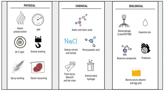 Among biological interventions, Hluchanova et al. [] investigated the effectiveness of ListexTM P100 against L. monocytogenes, artificially inoculated into steak tartare samples. P100 is a phage that is commonly used to combat L. monocytogenes and was originally isolated from the wastewater of a dairy plant. Twelve samples of steak tartare were inoculated with a sensitive isolate of L. monocytogenes LV1242, and another twelve samples with a resistant isolate of L. monocytogenes LV830 were used to reach a load of 3 Log CFU/g in the samples. In the first experiment, the concentration of P100 used was 8 Log PFU/g, which was not effective against sensitive isolate LV1242 and resistant isolate LV830 at all; in the second, it was 9 Log PFU/g, and a slight reduction in the count of sensitive isolate LV1242 was observed after 1 h of treatment, but it did not affect LV830 at all. The result is concordant with the suggestions of EFSA [], which states that treatment with this product should only be considered as an additional tool following the application of Good Hygienic Practices (GHP) and Good Manufacturing Practices (GMP), since it does not guarantee the complete inactivation of L. monocytogenes.