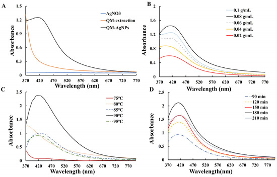Following the experimental methodology described above, the color changed to dark brown, indicating the successful synthesis of silver nanoparticles. Figure 1A shows the position of the characteristic absorption peak of QM-AgNPs. Figure 1B–D shows UV-vis spectra of silver nanoparticles synthesized under different conditions.