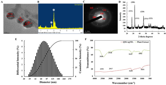 TEM images of spherical QM-AgNPs (A); EDX spectra of QM-AgNPs (B); XRD (C) and SAED (D) spectra of QM-AgNPs; particle size distributions of QM-AgNPs with respect to intensity (E); FTIR spectra of QM-AgNPs and QM power (F).