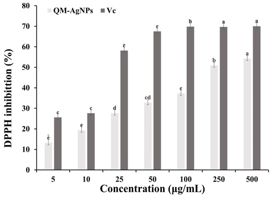 It can be seen from Figure 4 that QM-AgNPs exhibit the significant ability of scavenging DPPH free radicals in a concentration-dependent manner. Since QM itself is rich in flavonoids, polysaccharides, and other active ingredients that can scavenge free radicals, when QM-AgNPs was synthesized from the QM extract, these active ingredients adhered to the surface of nanoparticles, promoted the formation of QM-AgNPs, and allowed it to possess an excellent free radical scavenging ability. This result is consistent with what has been previously reported in the literature [48,49,50,51].