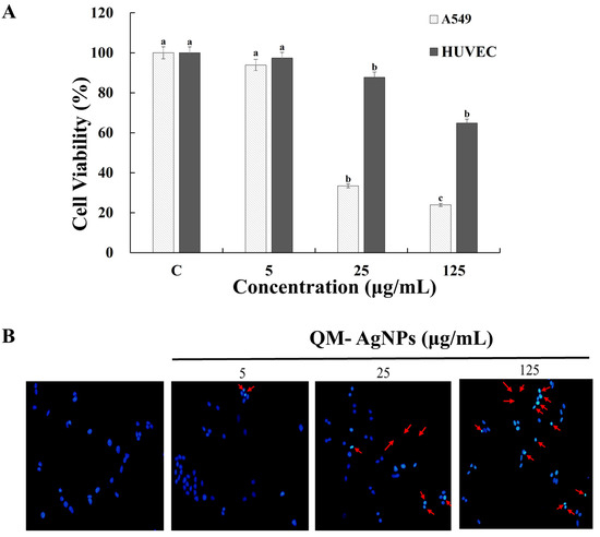 A549 cancer cells and HUVECs were cultured in Dulbecco’s Modified Eagle Medium (DMEM) and RPMI-1640 medium supplemented with 10% fetal bovine serum (FBS) at 37 °C in a humidified atmosphere containing 5% CO2 and 95% air. The cytotoxicity of QM-AgNPs in A549 and HUVECs was determined using the the Methylthiazolyldiphenyl-tetrazolium bromide (MTT) assay.