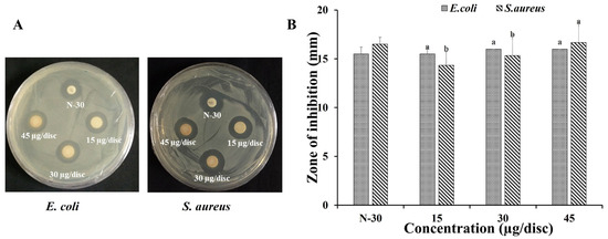 The paper-disk diffusion method [33] was employed to observe the sensitivity of Gram-negative bacteria E. coli, as well as Gram-positive bacteria S. aureus to QM-AgNPs and amikacin (positive control).