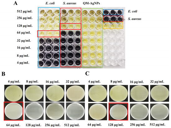The MIC was determined using the microdilution method [34]. The activated bacterial suspension was diluted to 1 × 106 CFU/mL. Liquid medium, QM-AgNPs at concentrations ranging from 4 to 512 μg/mL, and a bacterial solution were added to the 96-well plate, ensuring that the final volume of each well was 200 μL. All samples were incubated at 37 °C for 24 h. On the following day, MTT solution (5 mg/mL) was added and then incubated for 4 h. The color of the reaction solution in the 96-well plate was observed, and the lowest concentration that did not change color was recorded as the MIC.