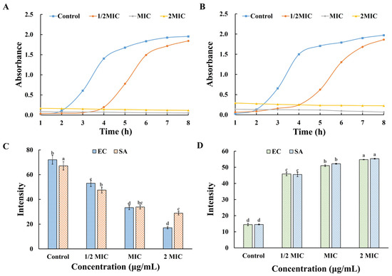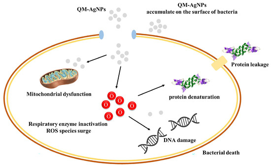 The growth dynamics curve was created following an established protocol [35]. Bacteria cultured overnight were diluted to approximately 1 × 106 CFU/mL with sterile LB broth medium, and a certain concentration of QM-AgNPs was added to achieve final concentrations of 1/2MIC, 1MIC, and 2MIC for each bacterium. The same volume of PBS buffer was added to replace QM-AgNPs as a blank control. The absorbance of OD600 was measured every hour, and the growth dynamics curve of QM-AgNPs’ inhibition of bacteria was plotted.