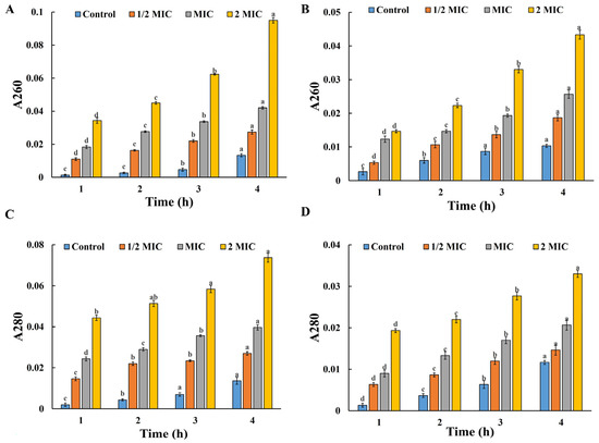 The quantification of nucleic acid and protein leakage was based on the previously described method [38]. Bacterial suspension at a concentration of 1 × 106 CFU/mL was centrifuged at 10,611× g for 5 min to obtain the bacterial pellet. The supernatant was discarded, and the precipitate was washed 1–2 times with sterile PBS buffer. The bacterial pellet was resuspended in sterile PBS buffer and mixed with various concentrations of QM-AgNPs to achieve final concentrations of 1/2 MIC, MIC, and 2 MIC for each bacterium strain, followed by incubation at 37 °C for 4 h. The bacterial suspension was centrifuged at 10,611× g for 15 min every hour, and absorbance values at 260 nm and 280 nm were determined using a UV-visible spectrophotometer. (Sterile PBS buffer was used as a blank control in place of the QM-AgNPs solution).