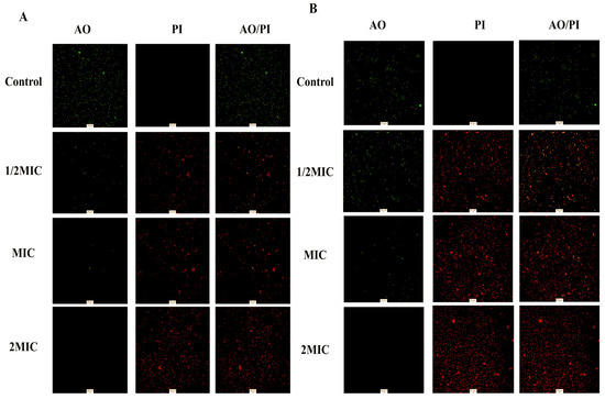 Activated bacteria were treated with different concentrations of QM-AgNPs, achieving final concentrations of 1/2MIC, MIC, and 2MIC for each bacterial strain. Sterile PBS buffer was used as the blank control. The mixture was incubated at 37 °C for 4 h. After incubation, an AO/PI staining solution was added to the bacterial solution and incubated for 15 min in the dark. The staining solution was discarded and the wells were washed with sterile PBS buffer 2–3 times to remove excess dye and QM-AgNPs. Then, the remaining liquid was aspirated onto a slide, covered with a coverslip, and observed under a fluorescence inverted microscope. The staining results are visualized via fluorescence microscopy, following the method described previously [39].