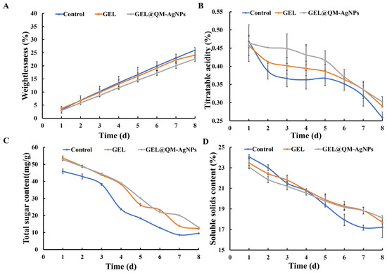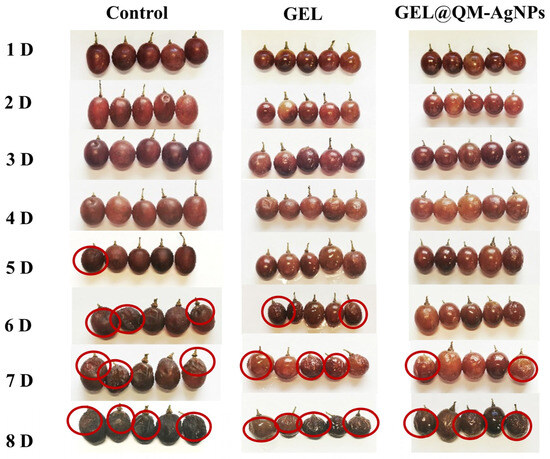 The spoilage rate is the most intuitive parameter to measure the freshness of fruit. Figure 14B shows the changes in the spoilage of grape samples in different treatment groups. The spoilage rate of all treatment groups increased with the storage time. When the grape samples were corrupted without any treatment, all of them were spoiled on the seventh day. The GEL group was able to form a coating on the surface of the grape samples, thereby reducing respiration and minimizing spoilage. However, due to its poor adhesion, the coating was separated from the grape epidermis as the grape samples lost water and shrank [71]. QM-AgNPs were added to the GEL@QM-AgNPs group to inhibit microorganisms on the grape’s surface, thus prolonging the storage time. The results show that the GEL@QM-AgNP coating can reduce respiration, inhibit microbial activity, and prolong the storage time of grapes to a certain extent.