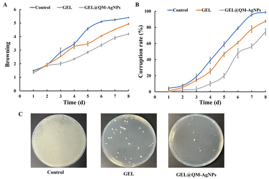 Browning degree is one of the criteria to evaluate the freshness of fruit. As can be seen from Figure 14A, with the prolongation of the storage time, the browning degree in the blank group is the greatest, and GEL@QM-AgNPs is the lowest. The reason may be that GEL@QM-AgNPs can greatly reduce the respiration of grape samples. The reduction of sugar consumption inside the fruit, as well as the addition of QM-AgNPs, can inhibit the microorganisms on the surface of the fruit, thus slowing down the browning of grape samples and extending the preservation time [70].