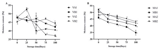 Changes in moisture content in different packaging methods of Mianning ham at the low-temperature storage stage: vacuum group (A) and modified atmosphere group (B). Note: MA1: modified atmosphere packaging at 4 °C for one year, MA2: modified atmosphere packaging at 4 °C for two years, MB1: modified atmosphere packaging at −4 °C for one year, MB2: modified atmosphere packaging at −4 °C for two years, VA1: vacuum packaging at 4 °C for one year, VA2: vacuum packaging at 4 °C for two years, VB1: vacuum packaging at −4 °C for one year, and VB2: vacuum packaging at −4 °C for two years. Lowercase letters indicate significant differences within the groups at the 0.05 level.