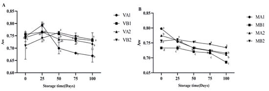 Changes in Aw in different packaging methods of Mianning ham at the low-temperature storage stage: vacuum group (A) and modified atmosphere group (B). Note: MA1: modified atmosphere packaging at 4 °C for one year, MA2: modified atmosphere packaging at 4 °C for two years, MB1: modified atmosphere packaging at −4 °C for one year, MB2: modified atmosphere packaging at −4 °C for two years, VA1: vacuum packaging at 4 °C for one year, VA2: vacuum packaging at 4 °C for two years, VB1: vacuum packaging at −4 °C for one year, and VB2: vacuum packaging at −4 °C for two years. Lowercase letters indicate significant differences within the groups at the 0.05 level.