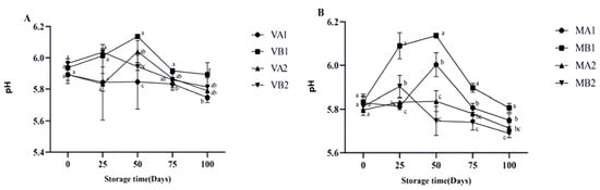 Changes in pH in different packaging methods of Mianning ham at the low-temperature storage stage: vacuum group (A) and modified atmosphere group (B). Note: MA1: modified atmosphere packaging at 4 °C for one year, MA2: modified atmosphere packaging at 4 °C for two years, MB1: modified atmosphere packaging at −4 °C for one year, MB2: modified atmosphere packaging at −4 °C for two years, VA1: vacuum packaging at 4 °C for one year, VA2: vacuum packaging at 4 °C for two years, VB1: vacuum packaging at −4 °C for one year, and VB2: vacuum packaging at −4 °C for two years. Lowercase letters indicate significant differences within the groups at the 0.05 level.