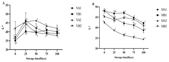 Changes in L* in different packaging methods of Mianning ham at the low-temperature storage stage: vacuum group (A) and modified atmosphere group (B). Note: MA1: modified atmosphere packaging at 4 °C for one year, MA2: modified atmosphere packaging at 4 °C for two years, MB1: modified atmosphere packaging at −4 °C for one year, MB2: modified atmosphere packaging at −4 °C for two years, VA1: vacuum packaging at 4 °C for one year, VA2: vacuum packaging at 4 °C for two years, VB1: vacuum packaging at −4 °C for one year, and VB2: vacuum packaging at −4 °C for two years. Lowercase letters indicate significant differences within the groups at the 0.05 level.