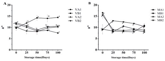 Changes in a* in different packaging methods of Mianning ham at the low-temperature storage stage: vacuum group (A) and modified atmosphere group (B). Note: MA1: modified atmosphere packaging at 4 °C for one year, MA2: modified atmosphere packaging at 4 °C for two years, MB1: modified atmosphere packaging at −4 °C for one year, MB2: modified atmosphere packaging at −4 °C for two years, VA1: vacuum packaging at 4 °C for one year, VA2: vacuum packaging at 4 °C for two years, VB1: vacuum packaging at −4 °C for one year, and VB2: vacuum packaging at −4 °C for two years. Lowercase letters indicate significant differences within the groups at the 0.05 level.