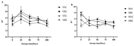 Changes in b* in different packaging methods of Mianning ham at the low-temperature storage stage: vacuum group (A) and modified atmosphere group (B). Note: MA1: modified atmosphere packaging at 4 °C for one year, MA2: modified atmosphere packaging at 4 °C for two years, MB1: modified atmosphere packaging at −4 °C for one year, MB2: modified atmosphere packaging at −4 °C for two years, VA1: vacuum packaging at 4 °C for one year, VA2: vacuum packaging at 4 °C for two years, VB1: vacuum packaging at −4 °C for one year, and VB2: vacuum packaging at −4 °C for two years. Lowercase letters indicate significant differences within the groups at the 0.05 level.