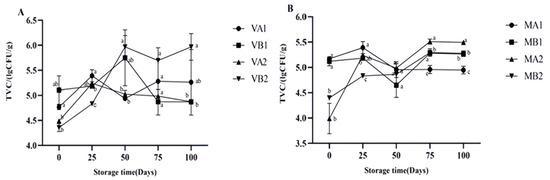 Changes in total viable count (TVC) in different packaging methods of Mianning ham at the low-temperature storage stage: vacuum group (A) and modified atmosphere group (B). Note: MA1: modified atmosphere packaging at 4 °C for one year, MA2: modified atmosphere packaging at 4 °C for two years, MB1: modified atmosphere packaging at −4 °C for one year, MB2: modified atmosphere packaging at −4 °C for two years, VA1: vacuum packaging at 4 °C for one year, VA2: vacuum packaging at 4 °C for two years, VB1: vacuum packaging at −4 °C for one year, and VB2: vacuum packaging at −4 °C for two years. Lowercase letters indicate significant differences within the groups at the 0.05 level.
