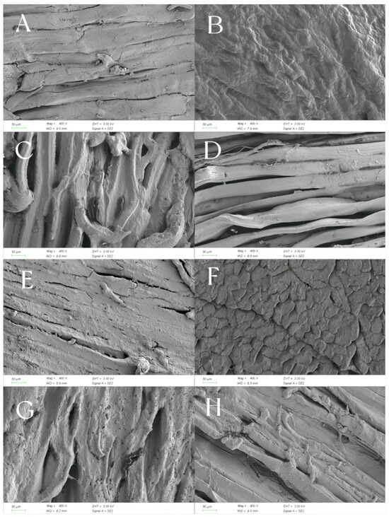 The microstructure changes in Mianning ham stored in different packaging methods at low temperatures are shown in Figure 9. As can be seen from Figure 9A,D,H, The muscle fibers are arranged in strips and have a relatively high degree of fiber integrity. The fibers in Figure 9A are wrinkled but continuous, while those in Figure 9D are parallel and compact. Figure 9C,G displays fiber dispersion and increased porosity. The interfiber voids in Figure 9C are obvious. The fibers in Figure 9G are looser and form pores. In Figure 9E, the fibers are broken or damaged. In Figure 9B, the surface is smooth and uniform, forming a dense structure. In Figure 9F, there are surface crack-like cracks. Therefore, the fibers in Figure 9A,D are intact and closely arranged, indicating that the ham has a firm texture. The samples in Figure 9C,G have loose fibers and many pores, indicating that the ham is relatively soft and loose. The surface cracking in Figure 9F indicates that the ham has poor water retention and a tough and hard texture. From the microstructure, it can be found that the ham in modified atmosphere packaging is tighter and stiffer, while the ham in vacuum packaging is softer and looser.