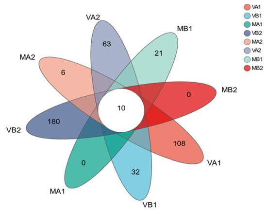 Venn diagram based on OTUs. Note: (1) Bacterial OUT distribution diagram; (2) MA1: modified atmosphere packaging at 4 °C for one year, MA2: modified atmosphere packaging at 4 °C for two years, MB1: modified atmosphere packaging at −4 °C for one year, MB2: modified atmosphere packaging at −4 °C for two years, VA1: vacuum packaging at 4 °C for one year, VA2: vacuum packaging at 4 °C for two years, VB1: vacuum packaging at −4 °C for one year, and VB2: vacuum packaging at −4 °C for two years.