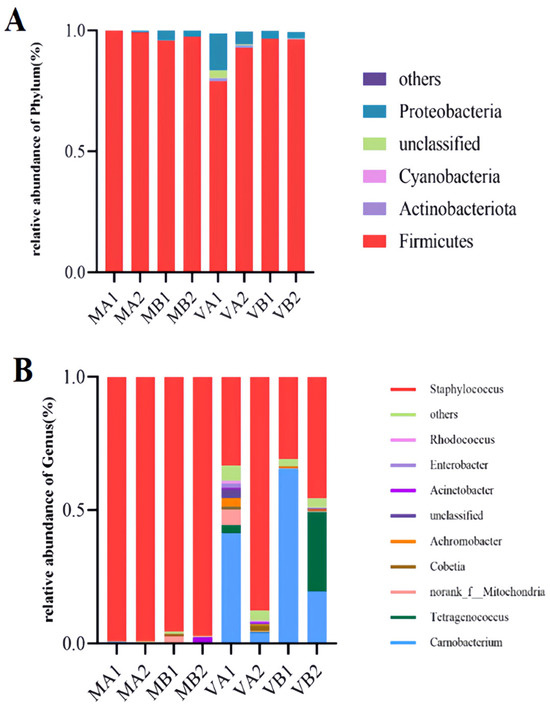 Species relative abundances of bacteria at phyla and genus levels (A,B). Note: (1) A—stacking diagram of bacteria at the phylum level, B—stacking diagram of bacteria at the genus level; (2) MA1: modified atmosphere packaging at 4 °C for one year, MA2: modified atmosphere packaging at 4 °C for two years, MB1: modified atmosphere packaging at −4 °C for one year, MB2: modified atmosphere packaging at −4 °C for two years, VA1: vacuum packaging at 4 °C for one year, VA2: vacuum packaging at 4 °C for two years, VB1: vacuum packaging at −4 °C for one year, and VB2: vacuum packaging at −4 °C for two years.