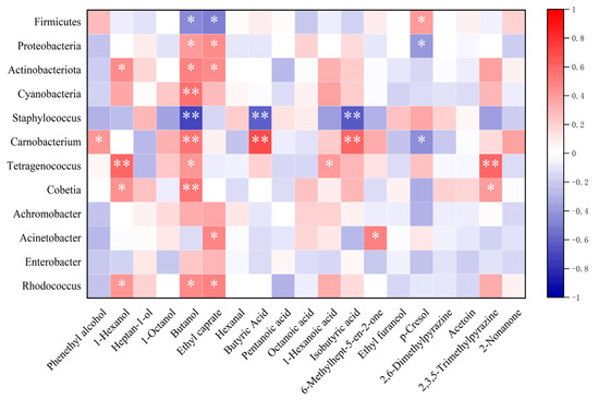 Heat map of correlation analysis between dominant microorganisms and key flavor compounds. Note: On the correlation heat map, the first four rows represent the correlation between the dominant phylum and key volatile compounds, while the last eight rows represent the correlation between the dominant genus and key volatile compounds. * significant correlation; ** extremely significant correlation.