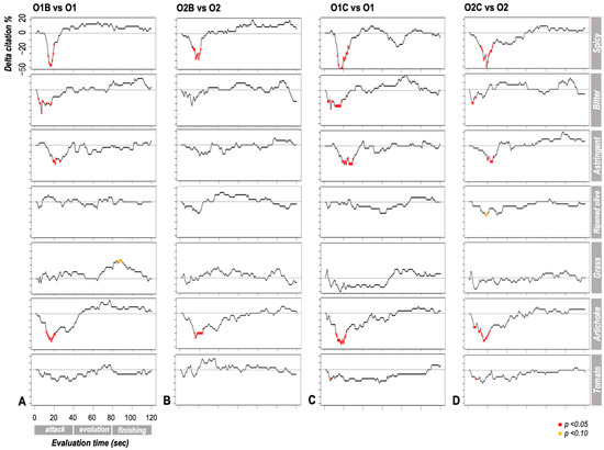 Difference in citation percentage (Δ citation %) for each attribute during the temporal sensory evaluation (Temporal Check–All–That–Apply) between (A) sample O1 alone vs. with bread (O1B), (B) sample O2 alone vs. with bread (O2B), (C) sample O1 alone vs. with chickpeas (O1C), and (D) sample O2 alone vs. with chickpeas (O2C). At each time point, negative values indicate a higher citation percentage for the sample consumed on its own. Points marked with red dots represent statistically significant differences (p < 0.05), while those with yellow dots suggest a marginal significance or tendency (p < 0.10).