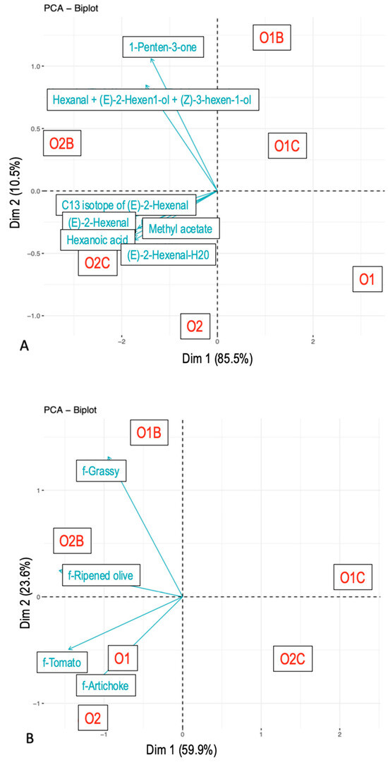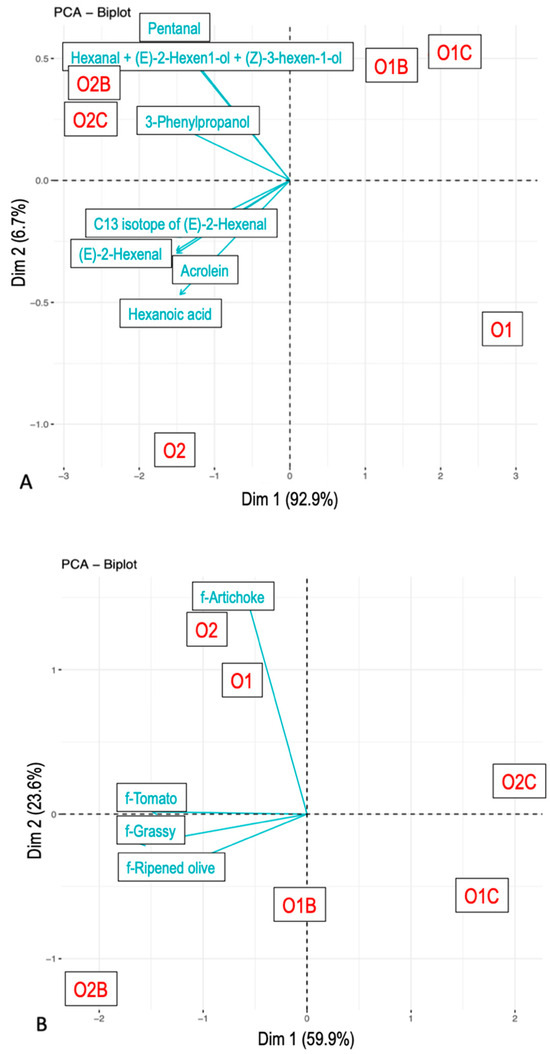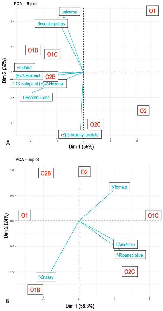 Principal component analysis. Maximum concentration from nose-space analysis curves (A) and citation rate from Temporal Check-All-That-Apply curves (B). Compounds were tentatively identified. The samples included O1—olive oil sample 1, O2—olive oil sample 2, O1B—O1 with bread, O2B—O2 with bread, O1C—O1 with chickpeas, and O2C—O2 with chickpeas.