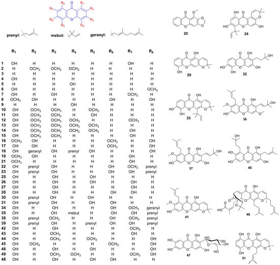 - Nguyen, C.N.; Trinh, B.T.D.; Tran, T.B.; Nguyen, L.-T.T.; Jäger, A.K.; Nguyen, L.-H.D. Anti-diabetic xanthones from the bark of Garcinia xanthochymus. Bioorg. Med. Chem. Lett. 2017, 27, 3301–3304. [Google Scholar] [CrossRef] [PubMed]