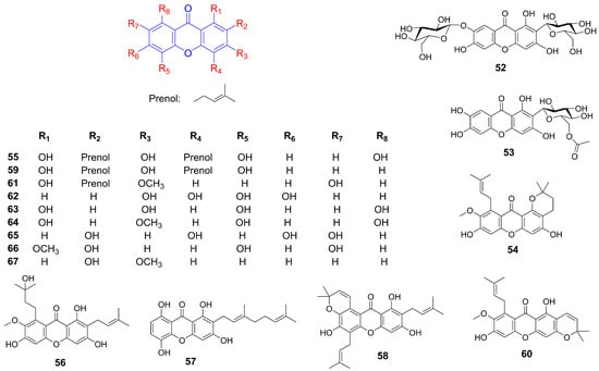 Mangiferin (47) promoted cholesterol efflux and attenuates atherogenesis by activating the PPARγ-LXRα-ABCA1/G1 pathway, and improves fatty acid metabolism in HepG2 cells by enhancing β-hydroxybutyrate levels, free fatty acid (FFA) uptake, and oxidation via the AMPK pathway [58,59]. In non-alcoholic fatty liver disease (NAFLD) models, mangiferin (47) mitigated liver injury, insulin resistance, and glucose intolerance by modulating glucolipid metabolism through AMPK activation and NLRP3 inflammasome inhibition [60]. In HFD-induced mice, it reduced body weight, triglycerides, and total cholesterol while suppressing inflammation and enhancing autophagy via the AMPK/mTOR pathway [61]. In hyperlipidemic hamsters, mangiferin (47) reduced body and liver weight, visceral fat, serum triglycerides, and free fatty acids by upregulating lipid oxidation genes and downregulating lipogenesis genes [62]. When combined with exercise in KK-Ay mice, it lowered blood cholesterol and triglyceride levels, while in fructose-fed spontaneously hypertensive rats, it reduced hepatic triglyceride content by inhibiting diacylglycerol acyltransferase (DGAT-2) [63,64]. Furthermore, in human mesenchymal stem cells (hMSCs), mangiferin (47) suppressed adipocyte differentiation and lipid accumulation by downregulating key adipogenic genes [65]. Moreover, mangiferin (47) also exhibited antioxidant properties, suppressing SREBP-mediated lipogenesis, and inhibits AGE-induced oxidative stress. In HFD mice, it enhanced mitochondrial capacity, thermogenesis, glucose, and insulin profiles, shifting fuel utilization from fatty acids to carbohydrates [66]. In cultured myotubes, it increased glucose and pyruvate oxidation, ATP production, and targets pyruvate dehydrogenase [67]. Neomangiferin (52) effectively ameliorated HFD-induced NAFLD in rats by decreasing body weight, liver fat, serum lipids, and glucose levels while enhancing serum HDL cholesterol and hepatic antioxidant levels, These effects are mediated by the upregulation of PPARα and CPT1a, and the downregulation of FATP2 and ACSL1 [68]. 6′-O-acetyl mangiferin (53) significantly reduced intracellular lipid and triglyceride accumulation in 3T3-L1 preadipocytes by activating AMPK [69]. In Apoe (−/−) mice, α-mangostin (22) attenuated atherosclerotic progression by reducing body weight gain, improving lipid profiles, and promoting M2 macrophage polarization. In Sprague Dawley rats, it alleviated HFD-induced hepatic steatosis by decreasing plasma-free fatty acids and liver triglycerides, improving antioxidant activity, and restoring mitochondrial function. Its potent antioxidant effects were demonstrated by prolonging the lag phase of LDL oxidation and reducing oxidative stress markers [70,71,72]. In HFD-induced obese mice, α-mangostin (22) improved metabolic profiles and obesity-related parameters by decreasing body, liver, and fat weights, as well as glucose, insulin, triglycerides, cholesterol, and fatty acid levels. Concurrently, it increased adiponectin, reducing inflammatory markers, improving glucose tolerance, and upregulating hepatic AMPK, SirT1, and PPARγ [73,74]. In diet-induced metabolic syndrome rats, it reduces body weight, abdominal fat, and improves liver and cardiovascular function by decreasing inflammation, collagen deposition, and reducing adipocyte size [75]. Additionally, α-mangostin (22) demonstrated anti-inflammatory and anti-adipogenic effects in 3T3-L1 preadipocytes by suppressing NF-κB and adiponectin, while γ-mangostin (23) reduced adipogenesis and inflammation by inhibiting Nrf2 activity and PPARγ expression [76]. Several xanthones isolated from Garcinia mangostana (Figure 3), including α-mangostin (22), β-mangostin (38), γ-mangostin (23), 1-isomangostin (54), gartanin (55), garcinone D (56), 9-hydroxycalabaxanthone (41), smeathxanthone A (57), tovophyllin A (58), 8-deoxygartanin (59), mangostanin (60), and 1,7-dihydroxy-3-methoxy-2-(3-methylbut-2-enyl) xanthen-9-one (61) exhibited inhibitory activities against pancreatic lipase with IC50 ranging from 5.0 to 34.5 µM (compared to orlistat IC50 3.9 µM) [77]. 3,4,5,6-Tetrahydroxyxanthone (62) ameliorated dyslipidemia in ApoE (−/−) mice by lowering plasma and hepatic lipids, while increasing HDL cholesterol via modulation of Angptl3 and LPL. It also improved erythrocyte deformability and reduced oxidative stress markers, MDA, and ADMA, indicating potential benefits for lipid metabolism and vascular health [78,79]. A high-throughput screening identified 1,3,5,8-tetrahydroxyxanthone (63) as an agonist that enhances the interaction between ABCA1 and apoA-I, promoting cholesterol efflux in ABCA1-expressing cells and THP-1 macrophages, as confirmed by flow cytometry, Western blot, and 3H cholesterol efflux assays. This compound also dose-dependently inhibited lipid accumulation in 3T3-L1 adipocytes by reducing PPARγ and C/EBPα expression while activating Hedgehog signaling components Gli1 and Smo [80,81]. Bellidifolin (64) significantly improves HFD-induced obesity and lipid disorders by reducing the abundance of Firmicutes, Lactobacillaceae, and Clostridiaceae in the gut microbiota, while enhancing bile acid biosynthesis and excretion to promote lipid metabolism [82].
