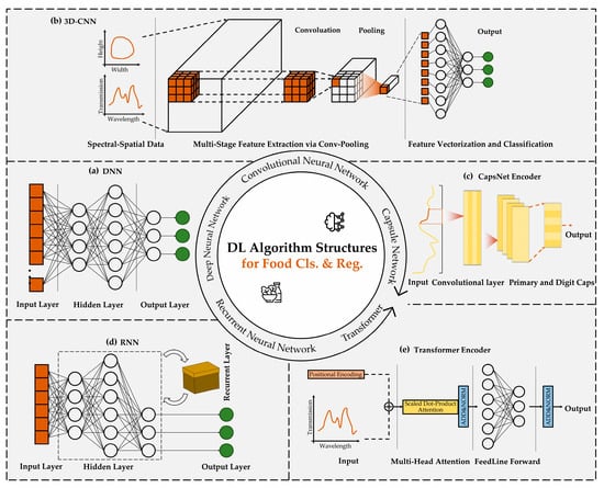 In the domain of food detection, fundamental deep learning algorithms primarily encompass regression, classification, and clustering, supplemented by dimensionality reduction algorithms for preprocessing. Advanced techniques, such as object localization and image segmentation, while crucial for complex applications like real-time production line monitoring, are essentially extensions of these foundational methods. This chapter focuses on core analytical algorithms specifically adapted for food inspection, showcasing their remarkable versatility through strategic modifications to network architectures, loss functions, and training protocols, enabling effective adaptation to diverse task requirements. For regression and classification tasks, established algorithms include deep neural networks (DNNs), CNNs, RNNs, Transformer architectures, and Capsule Networks (CapsNet). Clustering applications typically utilize autoencoders (AEs), variational autoencoders (VAEs), and Deep Embedded Clustering (DEC), with enhanced performance achieved through optimized frameworks like VAE and Stacked Sparse Autoencoders (SSAEs). Emerging hybrid architectures such as CNN–Transformer integrations further demonstrate the field’s evolving methodological sophistication. To provide a comparative overview of the network structures utilized, Figure 1 depicts the architectures of the investigated deep learning models: (a) DNN, (b) 3D CNN, (c) Capsule Network encoder, (d) RNN, and (e) Transformer encoder, each targeting food classification and regression. Table 1 presents the key features, strengths, and limitations, as well as the representative application scenarios, of prototypical deep learning methods applied to regression, classification, and clustering tasks.