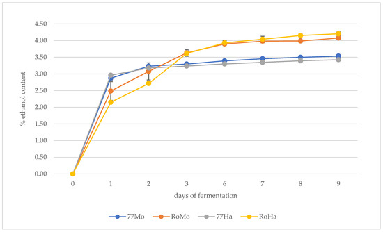It can be observed that alcoholic fermentation (AF) lasted 8 days, and the commercial strain Rock reached an estimated higher final alcohol content than ISE77. From a kinetic perspective, during the initial phase of fermentation, the samples brewed with Rock yeast and HM hops exhibited a slightly slower ethanol production rate compared to the other samples. However, after three days, they reached a comparable estimated ethanol percentage to the samples fermented with Rock yeast and Mosaic® hops.