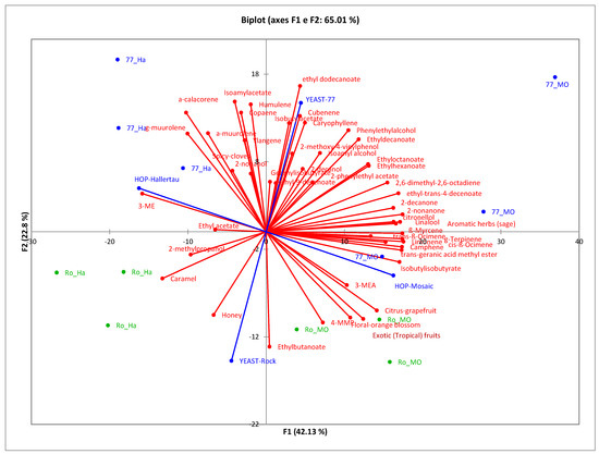 Principal component analysis (PCA) was performed to visualise the relationships between yeasts, hops, and chemical compounds (Figure 2). The first two principal components, PC1 and PC2, accounted for 65.01% of the total variability. It is possible to observe that PC1 distinctly separates the hops used in this study, while PC2 separates the yeasts.