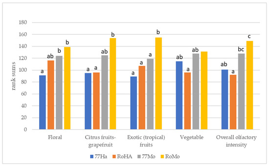 The panel ordered the samples with a ranking test (ISO 8587:2006) [37] for the overall olfactory intensity and the intensity of the odours: floral (orange blossom), citrus fruits (grapefruit), exotic (tropical) fruits (pineapple, mango, passion fruit), and vegetable (tomato leaf, fig leaf, mint, sage, rosemary, boxwood).