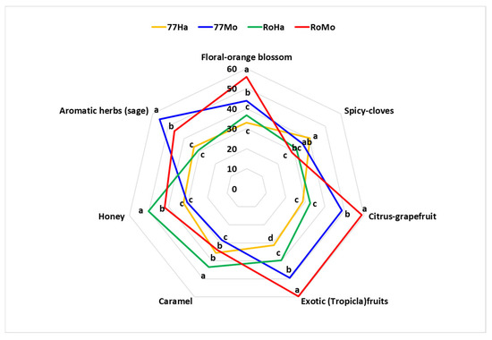 77Mo samples exhibited the highest intensities for aromatic herbs (sage), and similar but statistically lower intensities for floral, citrus, and tropical (exotic) fruits compared to RoMo samples. Hallertau assays showed the lowest intensities for floral, citrus, and aromatic herbs. For the “tropical fruits” attribute, all the samples were statistically significantly different.