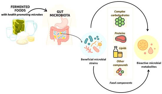 Furthermore, fermented foods are renowned for their abundance of antimicrobial substances, such as organic acids, ethanol, and bacteriocins, all of which are produced through microbial transformation either during food fermentation or within the gut microenvironment [3,5]. Another significant aspect of fermented foods is that their components can enter the human body either directly through interaction with beneficial live microorganisms or indirectly through the consumption of microbial metabolites produced during food fermentation [30]. In both cases, microbial activity interacting with food components can enhance the concentration of bioactive compounds. The fermentation of food raw materials can also take place in the gut, a bioprocess known as colonic fermentation. A key outcome of colonic fermentation is the increased bioavailability of various bioactive compounds, whose effectiveness often depends on the nature of the original food substrate. These microbially transformed metabolites are generally more potent in delivering therapeutic effects than their parent compounds [3,13,31].