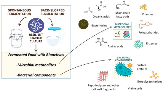 Microorganisms have been integral to food production since the earliest stages of human civilization, offering one of the most cost-effective and sustainable methods for food processing and preservation. Traditionally, fermentation processes were driven by spontaneous microbial activity originating from raw materials, which harbored complex, naturally occurring, and often taxonomically undefined microbial consortia [1,4,86]. Over time, the use of selected starter cultures has allowed for greater control, consistency, and predictability in fermentation outcomes. However, many traditional fermented foods are still produced through spontaneous fermentation, without deliberate microbial inoculation [2,23]. It is important to note that while some modern fermented products are processed in a way that eliminates viable microorganisms from the final product, the majority of widely consumed fermented foods such as yogurt, sour milk, kefir, cheese, kimchi, kombucha, dry fermented sausages, and miso retain substantial populations of live microbes. These often range from 106 to 109 colony-forming units per gram (CFU/g) [2,5,26,87,88,89,90]. Traditional fermentation practices include both spontaneous and back-slopped fermentation. In back-slopping, a portion of a previous successful fermentation (e.g., yogurt, whey, or sourdough) is used to initiate the next batch, allowing for the enrichment of a resilient and functionally adapted microbial community.