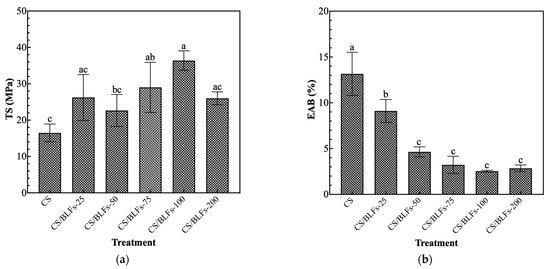 The effect of the addition of BLFs on mechanical properties. (a) tensile strength; (b) elongation at break. Bars with different letters indicate significantly different values (p < 0.05).