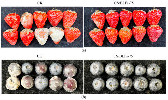 Regarding spoilage percentage, for strawberries (Figure 3b), the control group (CK) started showing signs of spoilage as early as day 4, with a rapid increase thereafter. By day 8, the CK group showed extensive decay (>50% surface coverage), reaching nearly 76.67%. The CS group also showed a certain degree of decay, whereas the CS/BLFs-75 group retained approximately 80% of its original appearance, with mold development limited to isolated spots (spoilage percentage ~56.67%), demonstrating remarkable inhibition. For blueberries (Figure 3d), the spoilage percentage increased rapidly in the CK group, reaching 50% by day 8 and 83.33% by day 10. CS coating delayed spoilage onset (23.33% on day 10), while CS/BLFs-75 and CS/BLFs-100 significantly suppressed microbial growth, achieving spoilage percentages of only 3.33% and 6.67%, respectively, on day 10.
