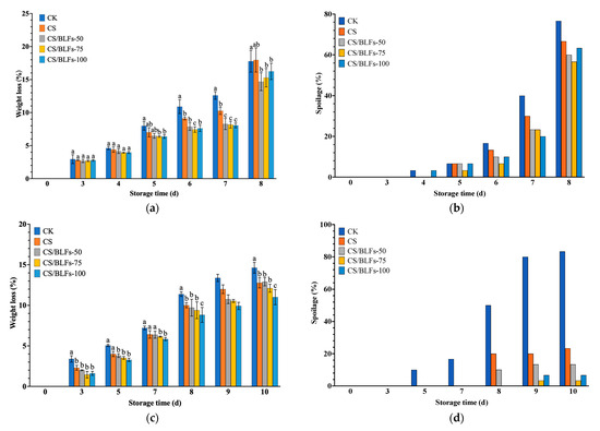 Weight loss and spoilage percentage of strawberries (a,c) and blueberries (b,d) stored at 25 °C for 8 and 10 days, respectively. Bars indicate the standard error of the mean. Columns labelled with different letters indicate significant differences with p < 0.05.