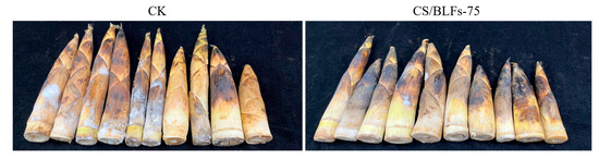 Visual observations of bamboo shoots during storage are shown in Figure 4. By day 7, the control group (CK) displayed severe enzymatic browning, with dark brown spots on the surface and a stiff texture, indicative of rapid lignification. In contrast, chitosan/BLF-coated groups maintained significantly better appearance: the CS group showed moderate browning and slight hardening, while CS/BLFs-75 and CS/BLFs-100 groups retained lighter color and tender texture, with minimal lignification. The CS/BLFs-75 group exhibited the least surface discoloration and maintained pliability, suggesting that BLFs effectively inhibited enzymatic browning and delayed lignification, consistent with their antioxidant and antimicrobial properties.
