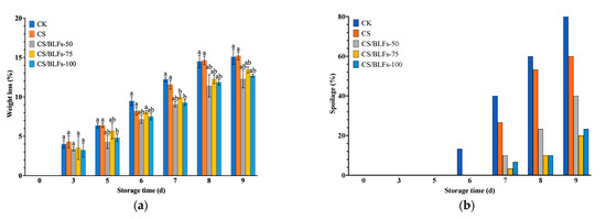 Weight loss (a) and spoilage percentage (b) of bamboo shoots stored at 25 °C for 9 days. Bars indicate the standard error of the mean. Columns labeled with different letters indicate significant differences with p < 0.05.